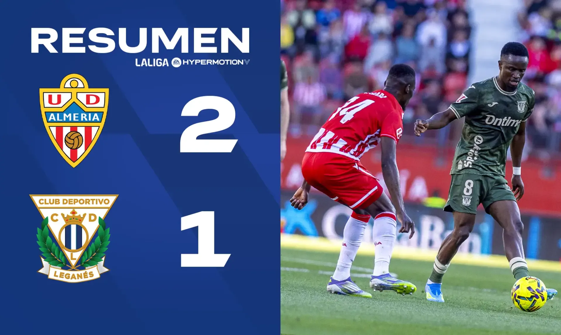 C.D. Leganés failed to pick up any points in their visit to U.D. Almería (2-1) in a match from Matchday 34 of LALIGA HYPERMOTION. Melero put the Pepineros ahead, but Arribas and Melamed—the latter in stoppage time—staged a comeback for the home side.
