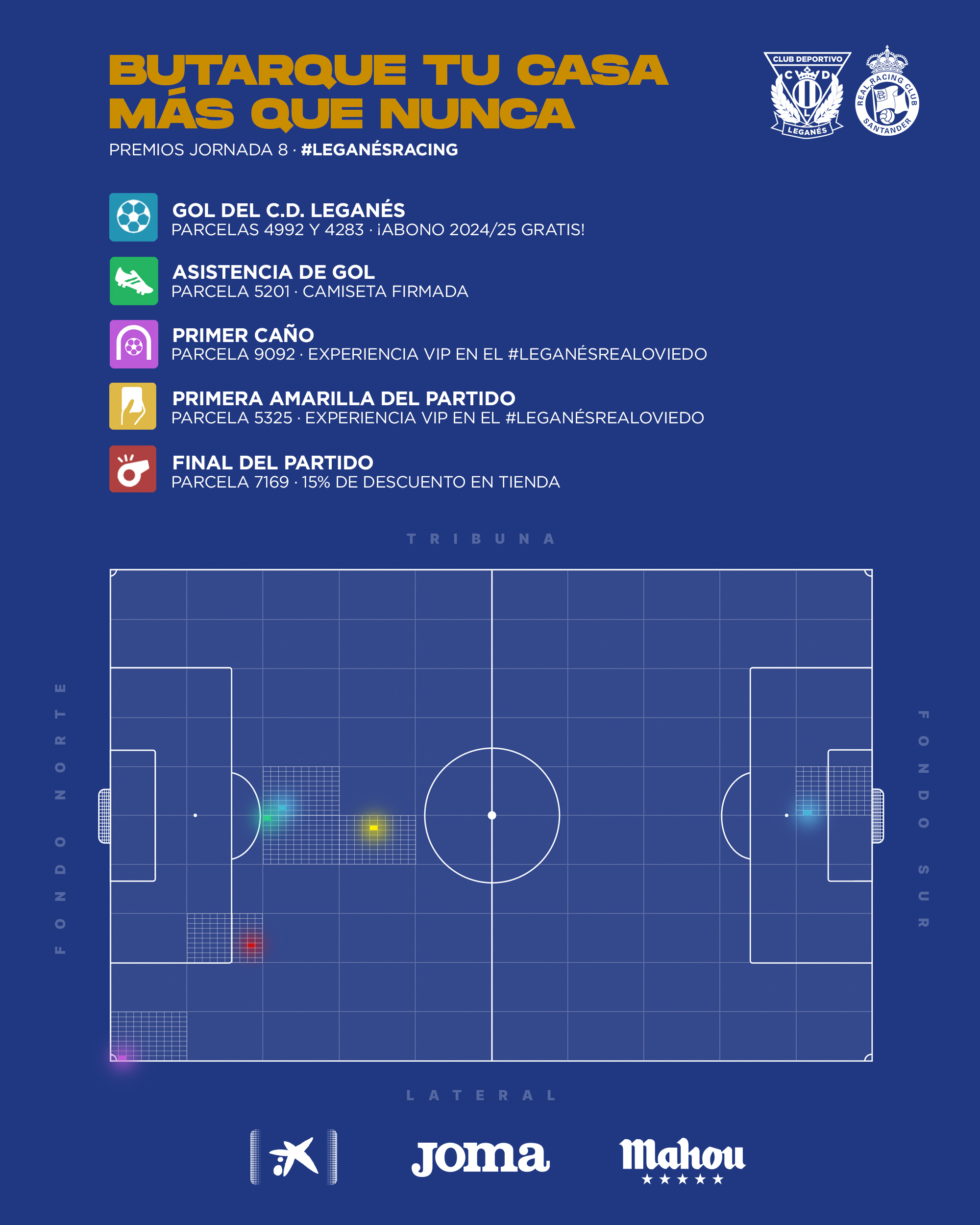 La parcela 5325 fue en la que ocurrió la falta que provocó la primera tarjeta amarilla del partido, y su propietario se lleva una experiencia VIP en el próximo partido ante el Real Oviedo. Mismo premio para el propietario de la parcela 9092, donde se produjo el primer caño del choque. Por su parte, la parcela 7169, donde se pitó el final del partido, obtiene un 15% de descuento en tienda.