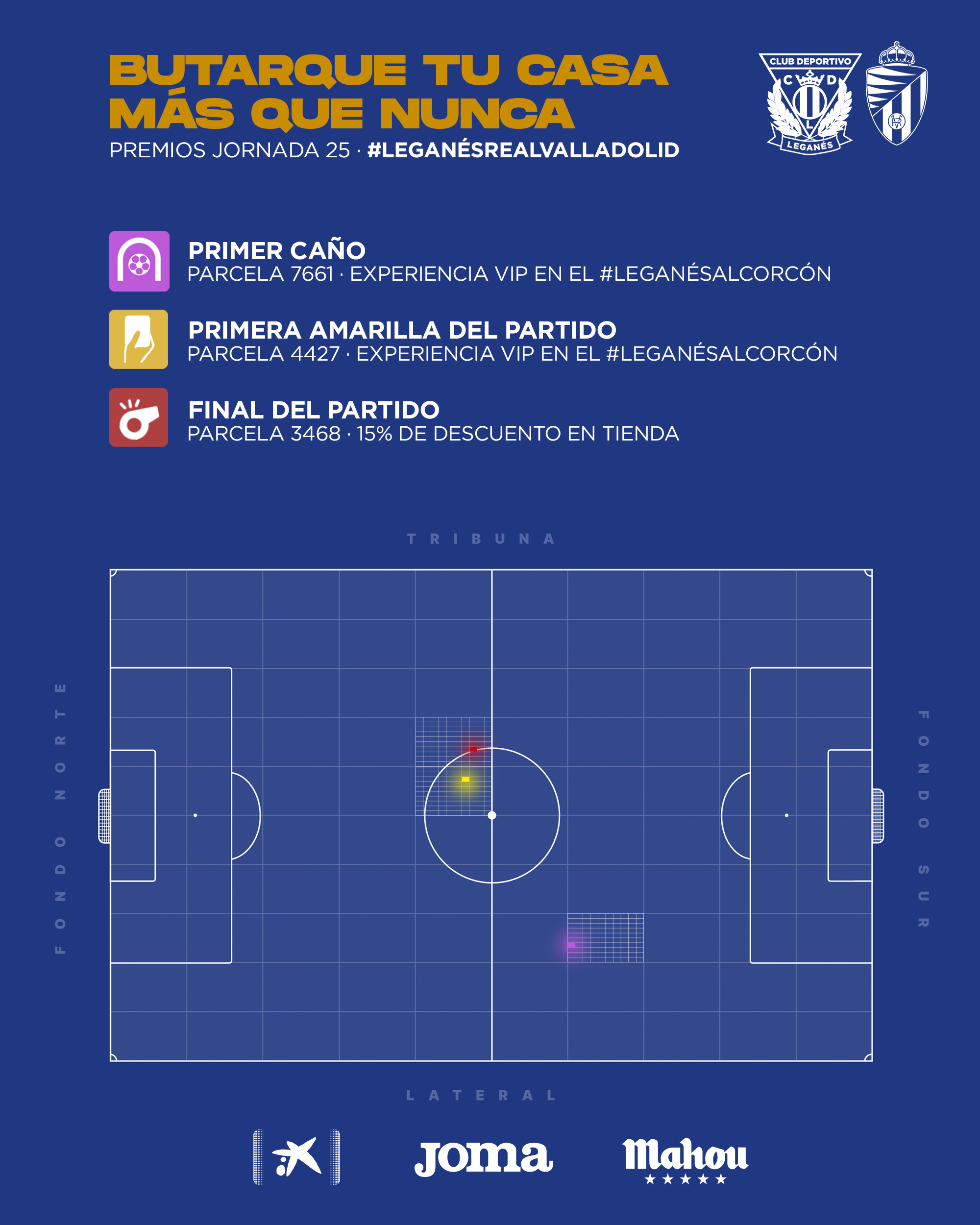 En esta jornada, se llevan dos experiencias VIP para el próximo partido en Butarque los propietarios de las parcelas 7661, donde se produjo el primer caño del partido, y 4427, en la que se mostró la primera tarjeta amarilla del encuentro. Además, la parcela 3468, en la que se señalizó el final del partido, se lleva un 15% de descuento en la tienda oficial del club.
