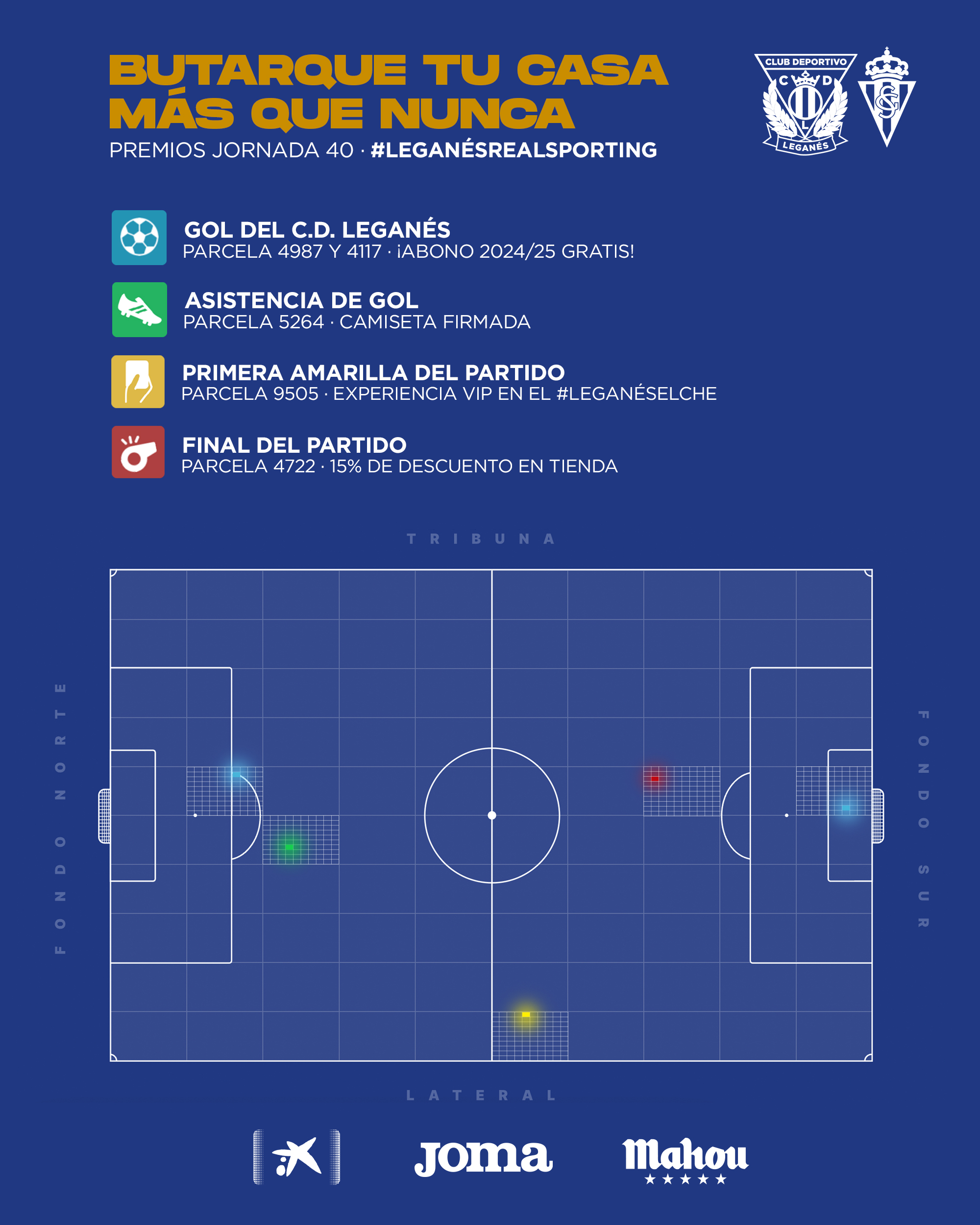 Una experiencia VIP para el próximo partido en Butarque se lleva el propietario de la parcela 9505, en la que se mostró la primera tarjeta amarilla del encuentro. Por último, la parcela 4722, en la que se señalizó el final del partido, se lleva un 15% de descuento en la tienda oficial del club.
